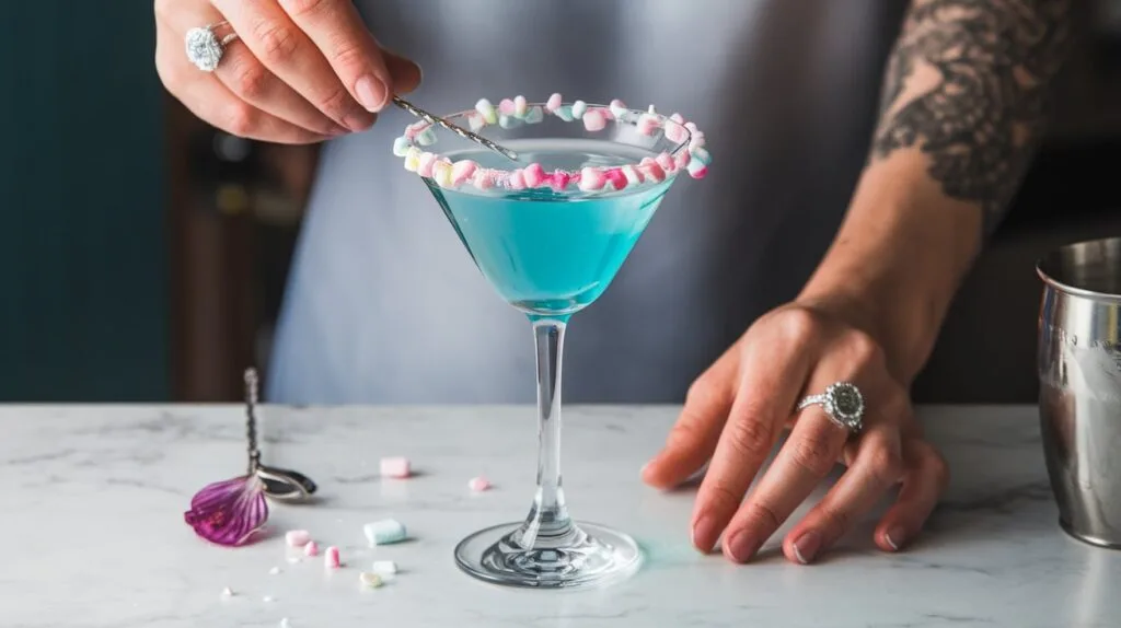 The final touches elevate this from a simple cocktail to an immersive experience. Float a gummy mermaid inside the cocktail—a playful nod to the drink’s nautical theme. Garnish the rim with a delicate candy mermaid tail. These aren’t just decorations; they’re conversation starters that invite interaction and wonder.