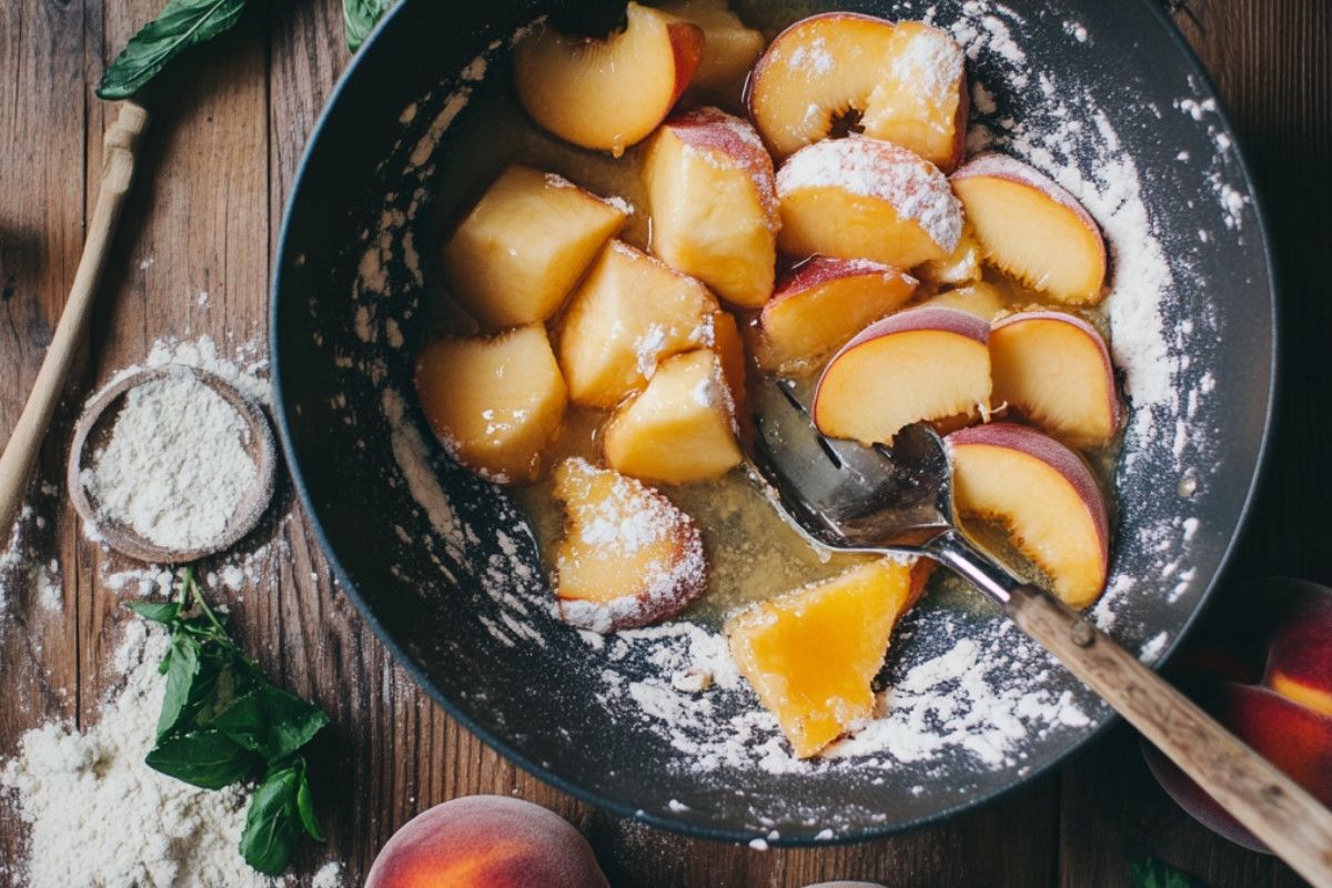 Simmer the peeled and pitted peaches with sugar, spices, and lemon juice over low heat. This process allows the flavors to meld and the mixture to thicken as the water content reduces.